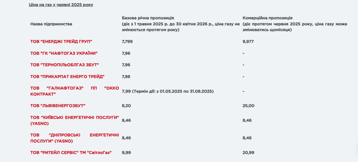 Годовые цены остальных поставщиков колеблются от 7,79 до 9,99 грн. за кубометр газа.