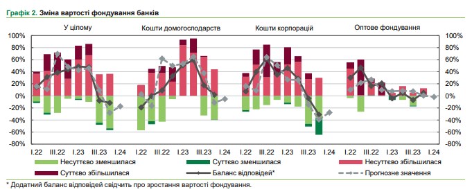 В январе — марте 2024 года большинство украинских банков ожидают снижения стоимости всех депозитов. Удешевление средств корпораций ожидают 69% респондентов, а средств населения — 50%.