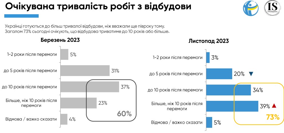 Доля украинцев, считающих, что восстановление страны после победы в войне с Россией будет продолжаться до 10 лет или более, в ноябре 2023 года увеличилась до 73%. В марте так считали 60% респондентов.